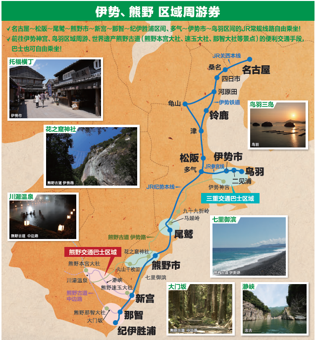 最新伊势熊野地区5日周游券 Ise-Kumano Area Tourist PassIse-Kumano Area Tourist Pass周游券是针对海外游客发行的新区域—伊势和熊野区域,覆盖熊野古道、熊野本宫大社、熊野那智大社、伊势神宫、鸟羽地区是日本历史悠久旅游地区,而当中熊野古道更是世界文化遗产。...