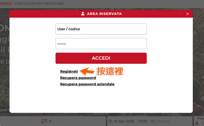 1.请使用意大利文页面:英文页面比较容易死机,所以建议大家在註册时还是使用意大利文的页面会最清楚也最稳定。进到意大利国铁Trenitalia官网首页https://www.trenitalia.com/,看到右上方的Area riservata用游標按一下