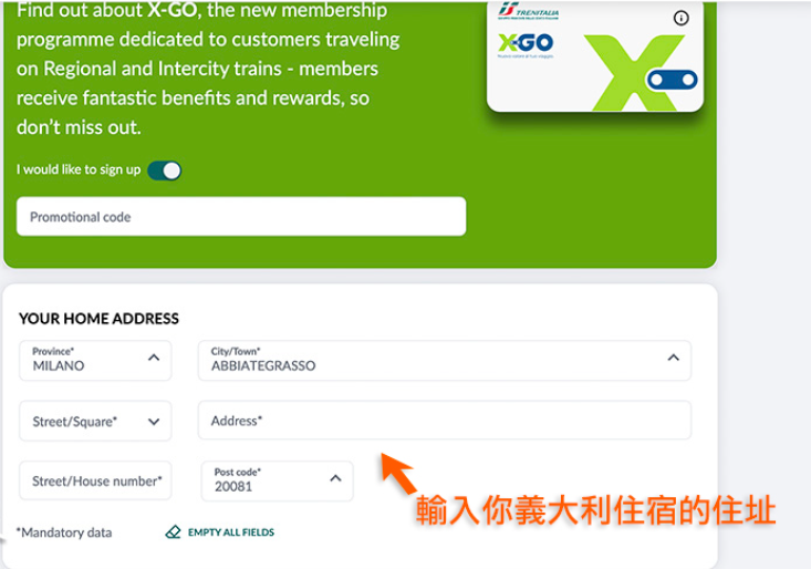*如果你勾选 I do not have a Tax Code没有税码(例如外国客户),也可以直接在 Trenitalia.com 网站上输入你的地点和出生日期进行註册,但你就不能加入Carta FRECCIA计划,意思就是购票后不能累积高数列车Carta FRECCIA的积分。