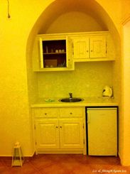 定的是豪华套间,里头有包括一件宽敞的客厅,卧室,卫生间,及橱柜料理柜,很是温馨,真想就这么赖着不走了。客厅一旁的简约小厨房,除了有洗漱台,抽屉和柜子里摆放着干净的餐盘,勺子,西式餐具还有各式玻璃酒杯和开瓶器等。小冰柜里的酒水饮料都是免费提供给客人的,反正七喜,可乐,芬达,啤酒一应俱全。还有1瓶1.5L的矿泉水,当然喝完就没有啦,不会再次提供了。但这种待遇还是让人很窝心。 个人还是很推荐这家家庭式旅馆,Oia Suite,离小镇15分钟步行的距离,房间干净舒适宽敞,服务热情贴心,早餐丰盛,至于风景...不用计算在内,这哪哪儿就是一处风景。