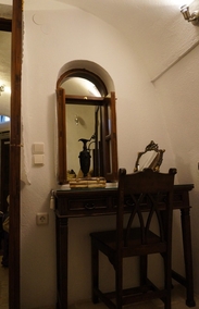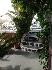 悬崖上的传统洞穴屋。紧靠巴士站,还蛮好找的。虽然酒店服务有一些小瑕疵,但不得不说,这个酒店的位置环境真的超棒!当刚看到这的景色时,我激动得甚至想哭,太美了!Alexander酒店,房间散落在悬崖的最美的角落里。190欧/晚。前台距离小镇中心走路大约5-10分钟,没有商业区的喧嚣和热闹,可以让人静静地欣赏随处可见的美景。我们在酒店共住3晚,前两晚被安排在距前台位置走大约需要5-7分钟的地方,靠近悬崖边。最后一晚是住在前台附近的房间。不知道是酒店刻意安排还是房间的预订出现撞车,总之,在一个酒店享受了两种不同的体验,总是觉得很超值!前两晚的房间,我真的很沉醉。房间相对设施比较落后,距离前台远,房间里没有电话,两天里有一天半热水器是坏的,只能洗凉水澡,第二天天气大雾,空调滴水,把我的箱子都湿了,可还好,新秀丽质量过硬!但是,但是,这些都完全没有影响到我的心情,因为房间的位置实在是太棒了! 房间的门口就是Jacuzzi,虽然水有点凉。在阳台上就可以欣赏到世界上最美的落日,最美的火山岛,最美的蓝色!傍晚,四周全部静悄悄的,坐在门口欣赏落日,吃着晚餐,好不惬意!最后一晚的房间,设施全部现代化,房间很大很宽敞,浴室里就有Jacuzzi,可以在温温的水里享受水疗。其实本来我是不打算换房间的,因为我太喜欢悬崖角落里的那一处优美了,可在前台的再三建议下,我还是换了,确实是不同的体验。只是,太累,好多细节没有来得及品。。。如此美景下的酒店,老板当然不想费神安排接送了! 酒店前台,其实就是一个很小很小的房间,厨房和前台合用,只有一张小桌子。但是,每天却能面对如此惊世美景。Check-in,如果在booking上订的房间,一定要记得打印或者记下预订号码,酒店要查的,并且还要留信用卡号。