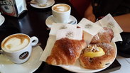 找到了住宿B&B,可是门是关着的,我们打电话给了老板,不一会来给我开门了,民宿在高级居民楼的2楼,走廊中间有个仅容2人的电梯,很迷你,很老式,也很有趣。 老板娘很热情,房间很宽旷,地方也安静,早饭是街口的咖啡馆提供的,意大利男人也就一杯咖啡和一个羊角包,我们每人吃了2个羊角包,哈哈,大胃王。