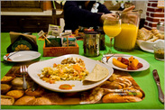 拖着沉重的背包一步一个台阶,终于走到La Casa de Dante,这个神奇的家庭旅馆的老板人非常热情,房屋像迷宫一样环绕,还有这墨西哥常见的骷髅壁画,很神奇。于是乎我就这样settle down,期待明天这小镇的神奇,我要同这个小镇一起呼吸!! 强力推荐这家La Casa De Dante,性价比超级高,因为是淡季我被安排在一个古色古香的2人间,本还担心会不会弄错,老板很慷慨的说没问题。更重要的是这里的早餐!!!我从来没有去过哪一家hostel早餐如此用心,墨西哥原汁原味的风情,草莓汁,巧克力奶,咖啡任你选,这家的阿姨并且很用心的烹饪早餐问你要是肉的还是素的。因为只有我和另外一个韩国人Joy,这皇家般的服务让我无言表达心中的欣喜。当然早餐是否合口因人而异,但是这个用心程度让人非常非常开心和感谢。阿姨还夸我说西班牙语说得好,的确的得多练习练习! 在墨西哥最神的旅馆依然是Guanajuato的La Casa De Dante。不过这间旅馆也很神的一点在于这里有世界各地的人,不同年龄不同背景。比如21岁挪威的小伙子kris如何身兼四份工作,这些工作无非就是酒保,小孩的保姆这些技术含量不高的,但依然可以工作半年旅行半年。还有38岁的日本女生,三年前如何在墨西哥当志愿者,现在如何在旅行社工作,她一口流利的西班牙语已经让我惊艳!还有德国人Christina如果在Puebla工作,分享她在古巴时候的纠结,比如她在古巴所能接触到的与离真实的古巴相差甚远。还有很多很多,大家在一起大侃特侃,墨西哥人怎么评论美国人,中国汉字和日本汉字怎么相似。旅馆虽小但却像一个联合国,大家坐在渐渐熄灭的火堆前分享彼此的经历。