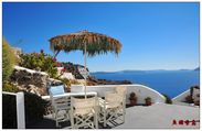 几乎在Oia小镇的最高处了,三面环海...酒店是依照悬崖的走势而建,因此从最高处的酒店入口逐级而下是一层层的房间,每个房间都是有一个相对独立的空间,有个属于自己的小阳台...我们的房间在最高层,是间“Romantic Cave House”,应该是这里户型和位置最好的一间了,视野开阔,而且离老板的房间很近,所以我们房间里的WIFI信号比较强...我们房间的上面是酒店的光景平台,旁边挨着两个希腊风格的大风车,平台上还有一个按摩浴缸(Jacuzzi)和几把躺椅,面向蔚蓝的爱情海... 因为在Oia有着号称全世界最美丽的日落,所以这里酒店的价格也就普遍比岛上其它地方的贵一些,特别是像我们住的这种位于悬崖边,有着最佳角度欣赏日落的酒店,据说在Oia也只有7家。这些酒店在每年旺季的时候要200-300欧一晚,而且还很难订到。因为难得来一趟,又是在这个美丽的天堂小岛,所以可以在前面的旅程中住些一般的酒店,而到了圣岛就不能太在意费用了,否则一定是要后悔的。我们出发前也确实是花了不少功夫,仔细研究了一遍圣岛大大小小的上几百家酒店,最后选定了Oia的Marizan Villas,好在圣岛的酒店从10月开始算是进入了淡季,所以可以花105欧订到这家性价比比较高的酒店,而且还是比较好的浪漫套间,事实证明我们没有选错,LP更是觉得在这家酒店给人的感觉非常温馨,即能欣赏到周围的风景,又非常幽静,避开了周围熙攘的游客,甚至比我们后两天在Firastefani镇住的150欧一晚的酒店还要好...