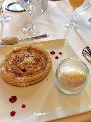我们的车从戴高乐机场开出20多分钟后,驶出高速路,开始进入一个小镇,对了,尚蒂伊到了。夕照下的小镇尤为美丽,朴素但高贵。距离巴黎不过40公里左右, 却已经是两个世界。还是那句用俗了的话,这里岁月静好。 慢慢驶入一片森林,视觉上已经让精神为之一振。没成想车渐渐放慢了速度,绕行进一个敞开的铁门,慢慢引入眼帘的是一座原汁原味的古堡。这竟是我们第一晚的下榻之处,真是惊喜万分。下车后,整个森林弥漫的神奇气息将疲累一扫而净。原来,这个古堡酒店由特为拉吉尼城堡(chateau de montvillagenne)改建,正是坐落于环境优美的尚蒂伊森林公园中心。古堡酒店内设明亮温馨,标准间的客房并非奢华,而是走田园style。姑娘们见了,一定心水。后来听说,这间酒店曾拍摄过韩剧:巴黎恋人,要知道思米答们是最会选景的,可想这个地方有多迷人了。 这家酒店的餐厅叫做Le vilargene,据说获奖无数。于是在其中的取名蓬芭杜夫人的包厢,用了晚餐。虽然用餐时,时差带来的睡意阵阵袭来,却没有麻痹味蕾对于美食的敏感度。餐厅里所有的陈设、实木的窗框和地板、落地的碎花窗帘都让这一餐变得尤为特别。窗外远处则是望不尽的树林,环抱在此等美景之中,酒不醉人人自醉。