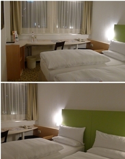火车站下来超级近,连着居然3幢ibis,我还真走错了呢。地方很小很小,2个箱子躺下就没地走路了。对面就有麦麦,不用怕无早饭。无免费wifi