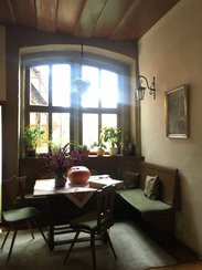 位置很好,就在小镇中心,而且可以停车,非常方便。在一个兼做餐馆的老房子里,只有几个房间,就在老城中心的游客信息中心旁边。我们订的舒适双人间房间很大(后来发现是给我们升级了),竟然还有很大的客厅,卫生间有点小。还可以坐在门外的小角落喝茶。房价含双早七百多,性价比很好,难怪在trip advisor和booking上评分都高。
