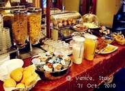 这个酒店让我难受到不愿意拿相机去拍它,却生生要去了我110欧一天。首先它不怎么好找,我们拖了行李沿着运河来回走了3圈也没发现它,问了好多附近开店的人也不知道。隐蔽在一个小巷子里,不仔细看很容易错过。没有电梯。好在楼层也不高,我们提着行李走上去,打开门,眼前的一切好似回到了50年前,不是复古,而是陈旧,以及一股腐朽的味道。房间设施很简单,灯,床,柜子,没有电视。卫生间的水会留到房间里。房费包含了早餐。大概是房间太老旧,以至于我们看到早餐的时候非常的惊喜,觉得很丰盛。光说它不好的了,这个酒店最大的优点,也是我选它的理由就是地理位置相当好。离火车站走路只要几分钟,到水上巴士车站也非常的近。