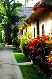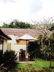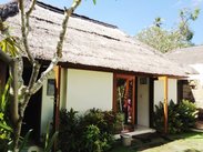 Jimbaran Puri共有42间比较老的Cottage Suite和22间新建的Pool Villa,都是独门独户的别墅,都有竹子和茅草搭成的屋顶,采用典型的巴厘岛建筑风格,从外面看很不起眼甚至有点简陋的感觉,但里面却是另一番景象,也算是走的低调奢华路线。我们前两晚住的是园景小屋套房(Gardenview Cottage Suite),面积也有120平米,有一个小小的私家庭院, 但没有泳池。我们很喜欢房间的色调和装饰。客厅没有隔断,也不是很大,但看上去很舒服,尤其喜欢大理石地板上铺的草席。全实木的洗漱台很有特色,但感觉不容易保养。
