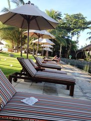 躺椅上的布艺非常有格调,这酒店白天几乎空荡荡的,总的来说人非常少,难道都在房间里吹空调?那种超大型酒店ayana和洲际我想这种闲暇是难得的吧?再一次为自己的选择得意一番。酒店的海滩非常漂亮,谁说金八兰的海滩过度开发的脏乱不已?至少在Puri Bali你能看到干净的海滩,酒店的躺椅也是非常充足。