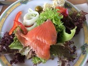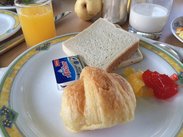 转天早上吃早餐,坐下的时候服务员会问你是否需要单点,我看了一下菜单,有中文,以为就是各种煎蛋,就点了三份,结果上来的时候傻眼了。根本是正餐的分量,有蛋有肉有配餐的那种。我还自己去自助区拿了一大堆,根本吃不完,又不能浪费,硬着头皮吃吧。茶和咖啡也是单点,我们喜欢喝果汁就没有点。早餐非常的丰盛,尤其是糕点类的很好吃,点的太多,都快吃吐了。我们快吃完的时候,发现餐厅里面也都快坐满了,欧美人的早上才刚刚开始呀。