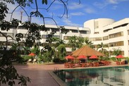 距离曼谷的老机场---廊曼机场很近,亚航的飞机都从这个老机场起飞,中间隔着一个天桥,喜欢泰囧的可以在此模仿下宝强。虽然这是间商务酒店,陈设偏旧,早上推开窗瞧瞧泳池碧波粼粼倒也赏心悦目,但不可能还有比基尼美女飘过,毕竟住在这儿也就图个方便。酒店的服务让人满意,服务员都可以用英语进行简单地沟通,说话时总是面带微笑客客气气的。酒店的早餐也非常丰盛,有很多的水果,泰国的芒果很甜。底楼的一个角落提供旅行服务,我问了下包车一日游的价格,真心不便宜,真当中国人都是好骗的款吗?