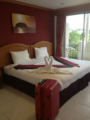卡塔海滩有个观景台(View Point)可以看日落,非常想去(我们太懒了下午五点才出门,在沙滩玩了会就日落了,也没找到观景台就放弃了),于是订了2晚KATA,Kata Beach Center Hotel (卡塔海滩中心酒店)。欧式装修,豪华3人间(上午我们还在清迈就从信用卡扣了2晚房费75.79美元,当时吓了我一跳)。房间特别宽敞,唯一一间叠了天鹅的酒店,水龙头水量足又热,我们凌晨到达一看很满意,睡得很好,有早餐,一楼还有个比浴缸大点的泳池。。。早餐一般(免费的)。性价比很高,推荐!
