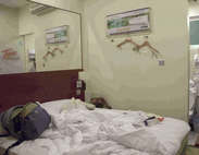 房间价格也比较贵,没要空调也没要任何服务含税300多RMB一晚了,好在睡的时间不多,第二天5点就要起床去赶飞机了。当时为了节约,只要了一间房,想着总比露宿机场要来的好吧,事实床虽然很小,但是横过来睡还是能挤下3-4人的,当然躺下后基本就不能大幅度动弹了(睡神可以考虑,不然还是建议不要轻易尝试)没有空调的房间到也不热,不过走廊上就更为凉爽了。