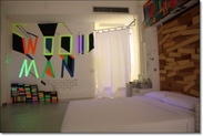 我们房间在3楼,从1楼入口要刷一次感应卡开门,可惜没电梯,30几度高温搬行李真的会飙出一身汗(还好下午有服务生帮我搬将近20kg的大行李箱,看他这样拼命晃上3楼不啰唆双手奉上小费50B)。进房第一眼的感觉有点失望,除了官网上已经看过的2面彩绘,其它墙壁都是小小的黑色涂鸦远看有点脏,地上的隔热铝箔泡棉(不知它的正确名称),被旅行箱轮子刮的都是痕迹还用胶带补起来,踩起来感觉不舒服,赶快穿拖鞋,顿时觉得这间房不值这个房价。