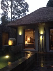 这里其实是一段villa惊喜之旅的开始。这家非常隐蔽,无论是我们的司机还是漂流的司机,都花了很长时间来找这家酒店。它藏身于一个村落中,外表看起来,感觉就是在两户人家的隔壁一样。但是里面真的可以用曲径通幽来形容。我们第一天因为到的很晚,酒店离乌布中心又有一定距离,就尝试了酒店厨师做的印尼当地晚餐。后来发现,印尼的饭菜并没有像论坛里同学们形容的非常难吃。也正是这家酒店的厨师给了我的美食体验一个美好的起点。 我们定的villa进去之后才发现房间真是无比的大,因为酒店所有服务都可以免费送到房间里。所有住的头两天,我们一直以为酒店就只有我们两个人入住,只在路过大堂的时候偶尔看到几个客人。私密性真的很赞! 要说住在这里唯一的缺点,就是离中心比较远,对于喜爱看景点,喜爱吃感受人潮汹涌的人来说,未免会失望很多。