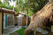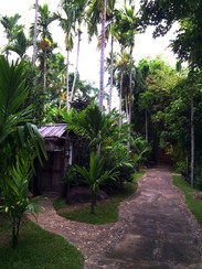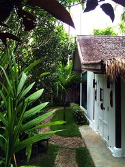 酒店的房间非常紧张,整个酒店只有7个独立的小villa,其中1-6是Honeymoon room,房7是family room。每栋独立的小villa大约有200多平,并包括室外浴缸和室外冲淋,每套房子都有小溪环绕,所以,在溪边还可以躲在树荫下乘个凉。当天在酒店享用了午餐,看之前网友的评论,就评说这家酒店的餐饮味道很不错,中午点了酒店的冬荫功汤,很好吃,味道非常好,但是,真是饿极了,照片也没有拍,就吃光了