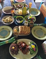 农场交通非常的便利,按时提供往返alona beach的穿梭巴士方便游客进出,还有机场免费接送哦!很多游客把beefarm作为一个景点来参观,不仅是因为农场的有机蔬菜和漂亮的悬崖餐厅view!更多是它的手工制品,包括手工皂,身体护肤及沐浴类产品,还有各种果酱和蜂蜜及小食!当然还包括各种水果口味的ice cream。姐妹们明早就要回马尼拉了,不惜超重,败了不少土特产馈赠亲友!午餐是蜜蜂悬崖餐厅的有机餐食,传说中可以吃的花儿很漂亮,只是味道没什么特别,个人觉得完全借助于色拉和蘸料提味,其余的餐食跟linaw和paprika相比略逊一筹。
