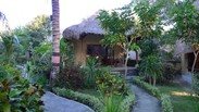 房间里有空调,无冰箱,无电视。开放式卫生间。淋浴、水盆、座便都有墙体隔断。竹筒包裹着水管,没有莲蓬头,水是从顶端流出的,原始的感觉,呵呵。无热水,太热,也无所谓啦。mushroon滩比较清静,coconut滩相对热闹,也是冲浪,及水上一日游的地方。除了villas,他们还有beach屋,独立的复式茅屋,450千卢比。它不是真正意义的建在沙滩上,而是沙滩后的岩石上,性价比更高。酒店泳池旁有两个大大的观景餐台,之间有台阶可以下到公共沙滩。 mushroom区没有夜市,很静。晚饭在花园店的开放式小餐厅解决。印尼炒饭(25千卢比)、印尼烤串饭(30千卢比)、玻璃瓶可乐(10千卢比)。还有一个好处,餐厅,确切地说应该是大号亭子,有花园店区的唯一电视看,42寸液晶。