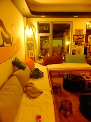 这个民宿,热血的年轻人一定会喜欢,太潮了,家居的配色,门板上的波普风格画作,还有数不尽的装饰物,一路蔓延到楼梯过道内,房门上也没有放过。冲浪板在屋子里到处可见,对了,这家民宿就叫做“猴子冲浪”。接待我的美女不知道是不是主人,问我吃饱了没,没等我反应过来,又微笑着说,“吃过饭没有”,我一脸尴尬。一楼是宽敞的客厅,可以坐在沙发里和背包客们聊天,紧挨着一座木制书柜,后面藏着一个迷你厨房,麻雀虽小,五脏俱全,各种东西自助使用,最后请记得物归原位。我住的是八人间,在四楼,其实只有四人在使用,房间足够宽敞,布置格外温馨,最棒的是有一个观景阳台。