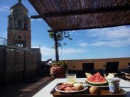 我们居住的酒店是本次旅行中最贵的一家,名字叫L’antico Convitto Hotel,房费115欧元。住进房间,发现房间并不能看见海景(后来我们逛到海滩边,还是看到了不少贴着大海的旅馆的,透明阳台,直接面海,应该不错,亲们可以仔细找找)觉得很遗憾。问了工作人员,发现这家在道道网上好评第二的酒店都没有海景房。那为什么它排名如此靠前呢?不一会儿我们便明白了其中的奥秘。我们和工作人员聊天中得知它有个屋顶花园,上到楼顶,找到了它家的屋顶花园在最靠近大海这一面,眺望着大海,左边是大教堂,朝右边看就是悬崖上的白色的建筑了。 美好的风光在夕阳下,在这个平台上铺展在我的眼前,那样静逸,又那样多彩!欣赏过美景后下来走到前台,发现朋友已经在和酒店的经理热聊起来,尽管朋友的英语并不好,但是帅哥经理非常热情好客,他拿出自己的手机秀给我看微信上的中国朋友。天!老外都是FACEBOOK的,微信是中国的产物好不好?我指着他的手机,惊讶地说:you, have web chat?仔细看了下,他的中国朋友也有几个来自上海,有这样热情的经理还有什么做不到?难怪评分如此高。他还拿出自制地图来为我们介绍周边的景点。手口并用,我们也很快明白了他的所有介绍。阿马尔菲与拉韦洛与波西塔诺同为阿马尔菲海岸最著名的城镇,同时以阿马尔菲为中心,乘坐SATA巴士都可以去往这两个城镇游玩,时间也不会太长。这里有一个链接:http://diy.eueueu.com/Step.mvc/StepOne_AttractionList/234,大家可以看一下介绍。我们由于时间的关系,所以只在阿马尔菲游玩了。