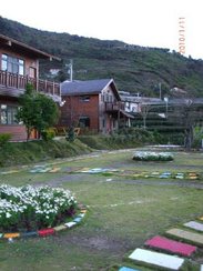 这家位于南投县的山坡坡上,这里有海拔最高的7-11,但是离住的地方很远(本来我们以为很近),度假村晚上很冷,因为在山里的缘故,冷到晚上要穿毛裤的程度,冷到晚上不敢洗澡怕冻感冒的程度。但是房间里的被子好暖和啊,貌似是羽绒的。屋里很特别,需要一进门就脱鞋,木地板装修很别致,看起来还有点高档。 民宿是二层小楼,下面一排,上面一排,门前是个小走廊,外面有一片空场,是早晨的朝阳和夜晚的星空最佳观赏点,空场里有一排小桌儿小凳儿,貌似可以举办BBQ之类的活动。地面用彩色的砖铺砌而成的小径,更给小村小庄添了些智趣 吃早餐的地方在另一个小楼里,早餐的咖啡是拿咖啡豆用咖啡机现磨的,很美味。(后来的早餐就基本都有这个了),这顿早餐很丰盛,可惜当时时间紧,要再多一天时间住这里,能悠哉游哉的享受一下就太完美了~咖啡杯。老板不得不夸奖一下,人超好又热心,我们大晚么赏要去7-11,老板怕我们有危险,免费叫员工开车载我们来回,临走还送我们棒棒糖,欢迎我们再去~呵呵