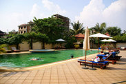 四星级,门面还算气派,门前的两尊是大鹏金翅鸟。走进酒店大堂,在前台check in的时候,服务员端上来两小杯冰镇的橙汁,喝下去冰爽畅快,暑热顿消,不得不赞一下服务真是周到。拿到钥匙进去房间,屋内的设施还不错,每天免费赠送两瓶矿泉水,冰箱里有饮料,但费用很高。房间里有热水壶,但是后来发现暹粒的自来水比金边的差很多,喝到嘴里都是咸的,放弃了烧水喝的想法。电视收的台不少,台湾的几个台都能看,当时是大选的时期,很热闹,还发现有HBO可以看,很兴奋。第一次住一楼的房间,离游泳池非常近,还带了泳裤,但几天里不是因为太累就是因为太晒,一次都没游过……