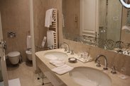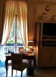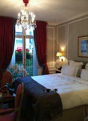 坐落在8区的蒙田大道上,离埃菲尔铁塔、香榭丽舍大街都是步行即可的距离。老实说订这个酒店纯属冲动之举,其中还有个故事。哪天不知是谁拿了张报纸说看下世界上最值得一住的10个酒店,其中之一就是巴黎的香格里拉大酒店,照片那是拍得美啊,看得我们蠢蠢欲动。到booking上一查我们选的日子没有房间,全部订满。好的东西一旦看过就难以忘怀,所以goole地图搜了下附近的酒店,就被我们搜到了这个,而且只有最后3间房,人的心理有时很奇怪,得不到的总归是好的,也不管价格如何,先订了再说,于是酒店就这样订下了。 住了之后的感觉就是:好,服务没话说,房间没话说,环境没话说,价钱更没话说。最后我们互相调侃道,这种上流社会的生活方式试过一次就好,以后再来,住斜对面的四星酒店就行。我们预定的是两件标准间和一间豪华间。豪华间与标准间的区别仅仅是房间的大小,里面的设施一模一样。