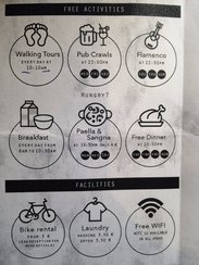 优点:位置很好,就在Plaza Nueva旁边,坐有轨电车T1很方便。附近有家英国宫,超市补货方便。厨房锅具灶具油盐酱醋齐全,做饭没问题。有免费早饭,虽然是比较简单的牛奶麦片和果汁。这家亮点蛮多的,可以见下图。免费晚饭是staff自己做的,虽然LZ吃不惯;会带去小酒馆看免费弗拉门戈,时间不长但也足够穷游族长长见识,正儿八经看一场弗拉门戈要18-25欧。 缺点:坐飞机或大巴到塞维利亚,都得从武器广场走过来,步行15分钟左右略远。住客实在太多了,尤其韩国人多。晚上厨房排队9点到10点都没烧上饭,中国人吃饭早,用厨房得赶早。洗澡龙头坑爹,是公共卫生间洗手台那种按一下出水几秒的龙头,很难控制水温和出水量,要当心突然冷水喷一身,这是LZ最不满意的一点,挂钩少洗澡不方便。公共空间小,楼下有个Bar比较吵。