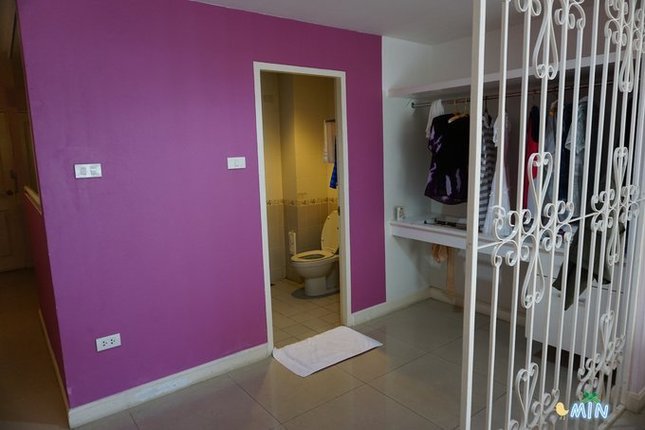不知为啥中英文译名完全对不上,熊叔叔的家听着很温馨很萌啊,紫色粉彩就有点人妖气质了。一眼相中的民宿,很温馨很少女的感觉,一幢小楼,一二层是上下复式七人间,三层和四层各是一间三人房。 优点:空间宽敞,地理位置优越(门口就是周日夜市,步行5分钟即是柴迪隆寺后门,lila马杀鸡步行5分钟的距离,距离her basics也就步行10分钟的样子),取现超级方便(民宿门口就是ATM机) 缺点:没有电梯,无早餐,店员小妹貌似不太会英文。设施略微陈旧,房间有些小蚂蚁。房费不能刷卡,只能支付现金。 我们的房间在三楼,是粉色风格的,四楼的貌似是蓝黑色系的。进门左侧有个小客厅,有微波炉,冰箱,餐具,电水壶,设备齐全;看到那扇蓝色百叶窗了吗,整个粉色墙面都是卫生间,窗口即是浴缸位置