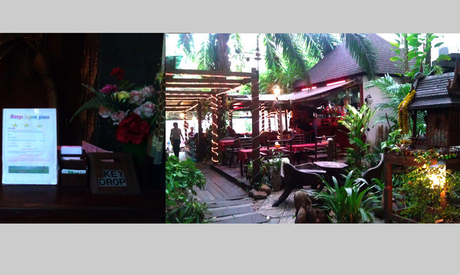 我外出没有事先预定酒店的习惯,都是现场“品鉴”。最终选择了Mango Lagoon Place,这间有着7、8层楼高的酒店,前边还有可以吃饭的花园,看起来还不错。我的窗户是面对湄南河一侧的,当然了,对面是有高楼阻隔的,河景是别想了。房间质量很好,隔音效果明显,房屋面积不大但两个人还是足够的。酒店门前的一条小街,吃饭、订票、数个7-11......反正是你需要的,这里都可以有。